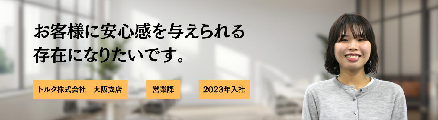 入社後は大阪支店で営業事務としてお客様を担当させていただいています。受発注やお問い合わせの対応をしながら、お客様や仕入先、営業、他部署などたくさんの人とのコミュニケーションが求められる仕事です。入社前は全く知識のない業界に不安を感じていましたが、毎日色々なお客様とやり取りしていると自然と知識がついてきました。何より周りには何かあれば必ずフォローしてくださる先輩・上司がいます。いつでも親切に教えてくれる、時には一緒に考えてくれる、そんな人の好さが大阪支店の魅力だと思います。トルクに入ってから刺激的な毎日を過ごしています。入社して2週間で制服がなくなって思いがけず私服通勤になったり、AIやChatGPTを活用した業務改善を考えたり…最近ではイラスト生成AIを使って、「トルクだより」に載せる大阪支店メンバーの似顔絵を作成しました。また在庫アイテムチームの一員として、在庫を活用した売上向上のための調査・資料作成を行ったりと新しい業務にも取り組んでいます。